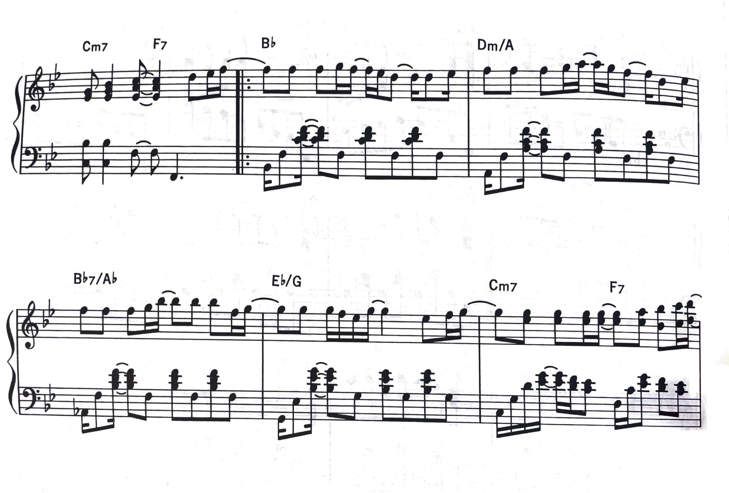 大譜表で右手の音と左手の音がどちらもしっかり書かれた楽譜を見て弾くのではなく、メロディにコードが書かれている、いわゆる『一段譜』でも弾けるようになるには、『基礎』編の内容で十分対応できます。