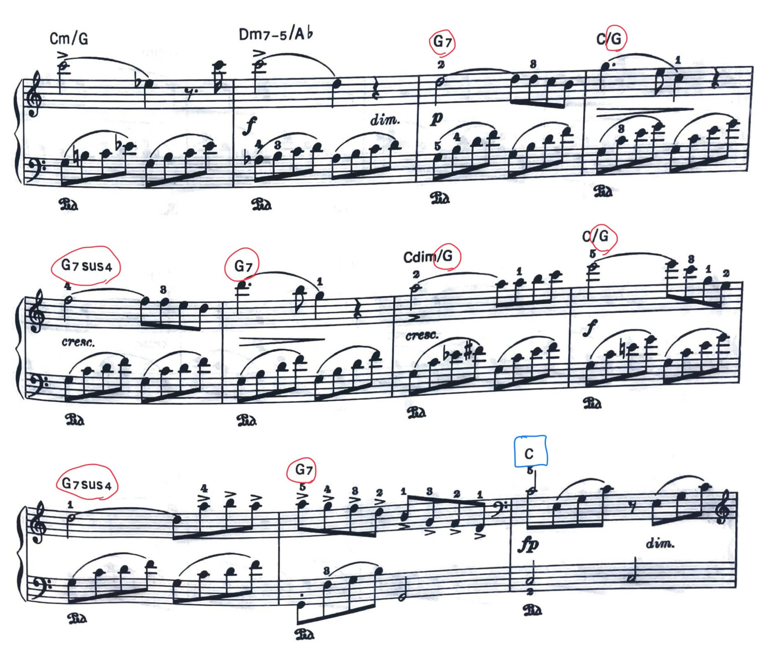 ふつう、調性音楽ではハ長調でGのコードが来たら、Cへと進むのが普通のパターンなのですが、それを簡単に終わらせないでずーーーっと引き延ばす感じですね。